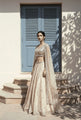 This is a stunning blend of modern sparkle and traditional grace, featuring a rose gold embroidered lehenga cape set adorned with reflective mirror embellishments.