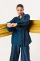 A deep teal co-ord set crafted in rich satin, featuring a textured front panel shirt with balloon sleeves and wide-leg trousers. Luxe, fluid, and effortlessly polished for elevated everyday wear