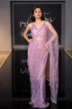 This ensemble features a breathtaking lavender draped saree adorned with intricate sequins and pearls that shimmers subtly, creating a graceful play of light.