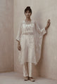 An ethereal kurta set crafted in soft ivory tones, layered with a sheer organza overlay.The neckline is richly adorned with intricate hand embroidery, creating a delicate focal point.Scattered embroidered motifs with tassels lend quiet texture and refined elegance throughout. Paired with tailored straight pants for a clean, contemporary silhouette.