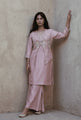 A soft blush kurta set layered with a delicately embroidered short jacket for refined elegance. The jacket is adorned with intricate floral and firework-inspired beadwork, highlighted with subtle pearl accents and fine hand embroidery. A matching inner kurta with a graceful V-neckline adds depth while keeping the silhouette clean and fluid. Paired with straight pants featuring subtle slit detailing and pearl embellishments at the hem.