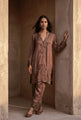 A rich Berry Brown kurta set crafted in a lustrous, fluid fabric that drapes with effortless elegance. The kurta features a deep V-neckline adorned with intricate tonal embroidery and delicate beadwork, extending into ornate motifs along the front. Embellished sleeve cuffs and a detailed hem add depth and artisanal refinement to the silhouette. Paired with matching straight pants finished with coordinated embroidery for a cohesive look.