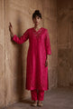 A refined silhouette crafted in crimson silk Chanderi, designed to drape with quiet elegance.Intricate tonal embroidery blooms across the neckline and sleeves, adding depth without excess. Sheer detailing at the yoke lends a soft, contemporary contrast to the structured form. Finished with delicate handwork that celebrates craftsmanship and restraint.