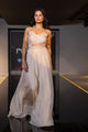 The fitted bodice of this champagne hued jumpsuit features delicate embroidery with a subtle shimmer, enhanced by a stylish midriff cutout that adds a contemporary touch.